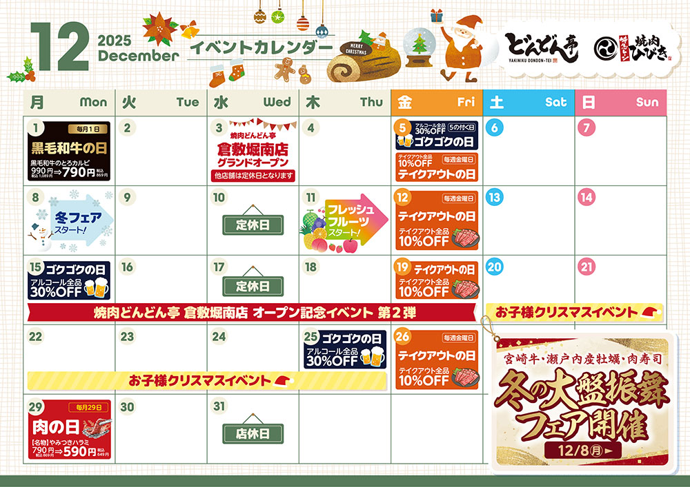 お得な期間をカレンダーにチェックして、ご家族やご友人と美味しい焼肉を囲んでください。