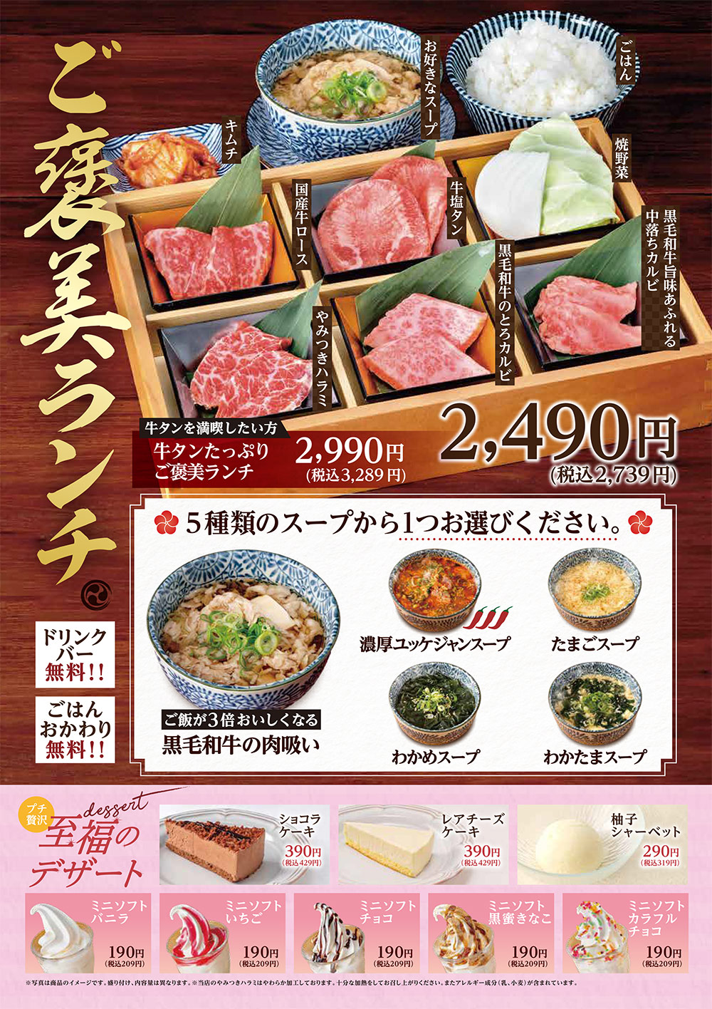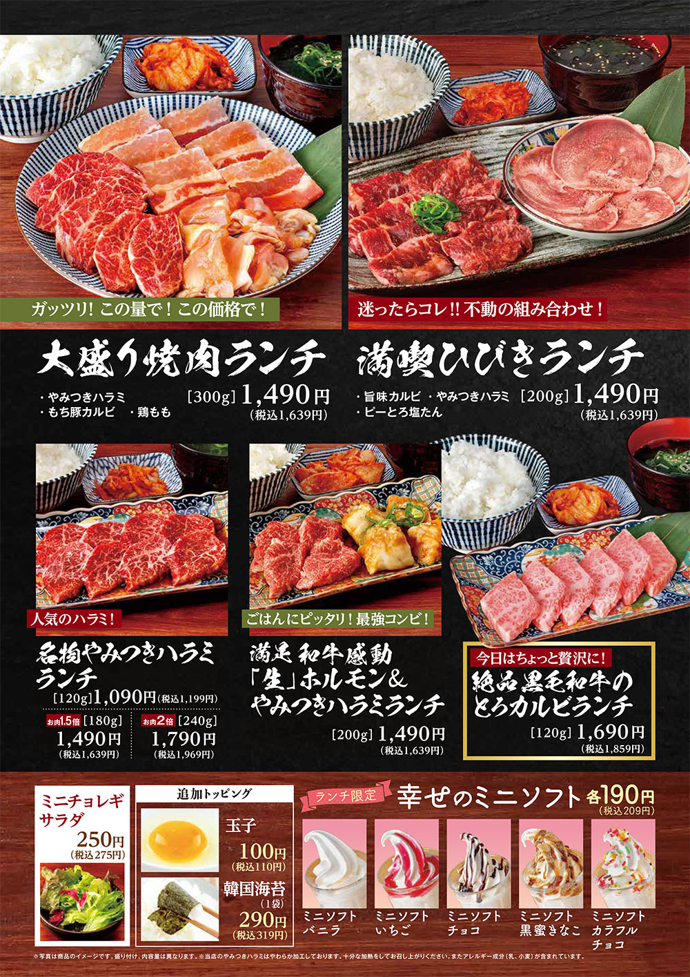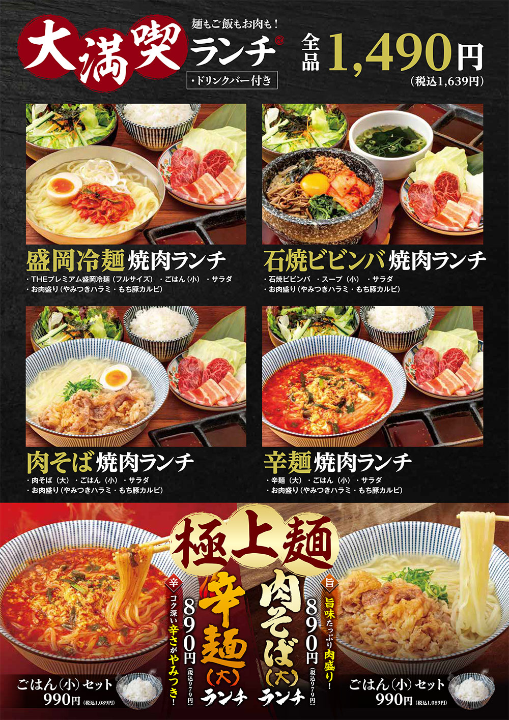 TOPランチメニュー 期間限定 ランチ グランドメニュー お子様メニュー ドリンク テイクアウト お昼ならではのお得なランチ(土・日・祝日は除く) 自慢のお肉を気軽に味わっていただける、お得なランチメニュー。 定番の「焼肉ランチ」から、麺もご飯もお肉も食べたい方におすすめの「大満喫ランチ」シリーズ、ちょっとしたハレの日やプチ贅沢に「ご褒美ランチ」、秘伝のタレが決め手の「カルビ丼」シリーズまで、毎日来ても飽きない豊富なラインナップをご用意しております。
