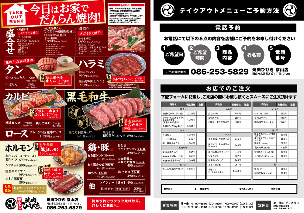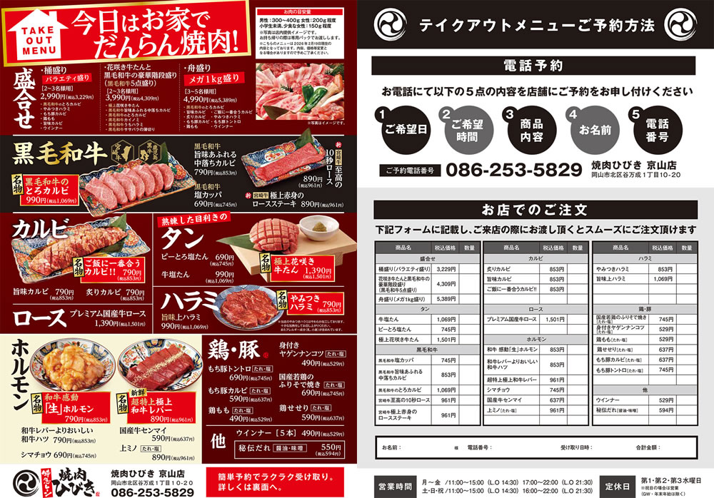 TOPテイクアウトメニュー 期間限定 ランチ グランドメニュー お子様メニュー ドリンク テイクアウト お家でもお店の味を お店の味をお家でも味わっていただけるよう、 「おうち焼肉」にぴったりの盛合せをご用意しました。 単品もご注文を承ります。